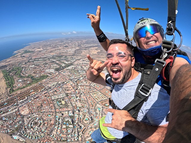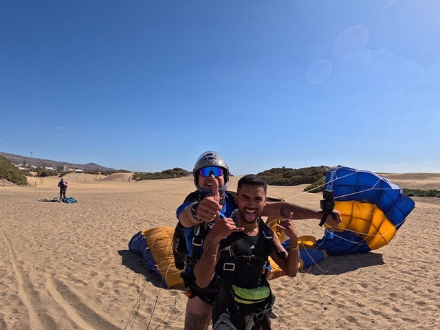 iJump Gran Canaria te ofrece una experiencia única de salto en paracaídas a 10.000 pies de altura, (3.000 metros sobre el nivel del mar) acompañado por un instructor que te acompañará desde el emocionante vuelo, la caída a 200 km/h y el descenso en paracaídas hasta el aterrizaje en las suaves arenas de Playa del Inglés