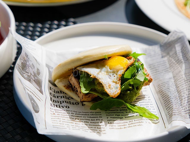 Bao de tofu marinado con huevo de codorniz y guacamole