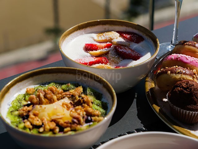 Yogurt sin lactosa con piña, arándanos, kiwi, nueces y chía