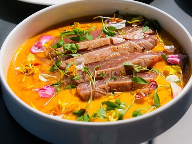 Tataki de atún con salmorejo de mango y aceite de soja cítrica
