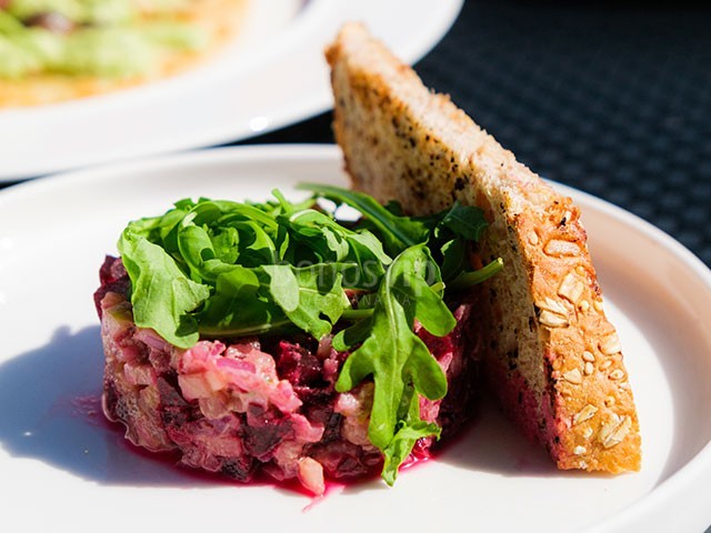 Tartar de remolacha con yema de huevo y mostaza antigua