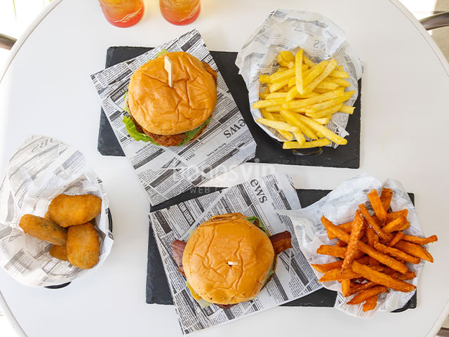Todo servido en pan brioche tostado, con lechuga y tomate