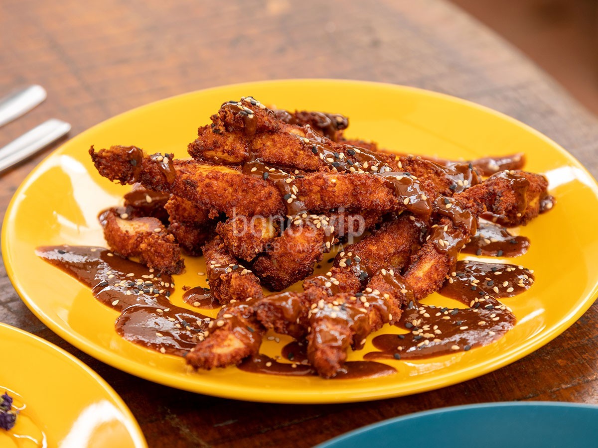 Tiras de pollo con salsa a elegir entre: cheddar, barbacoa, guacamole, mostaza miel, salsa picante
