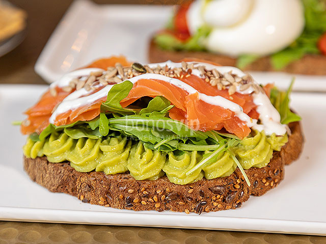Tosta de salmón: salmón ahumado, salsa tártara, tomate y rúcula