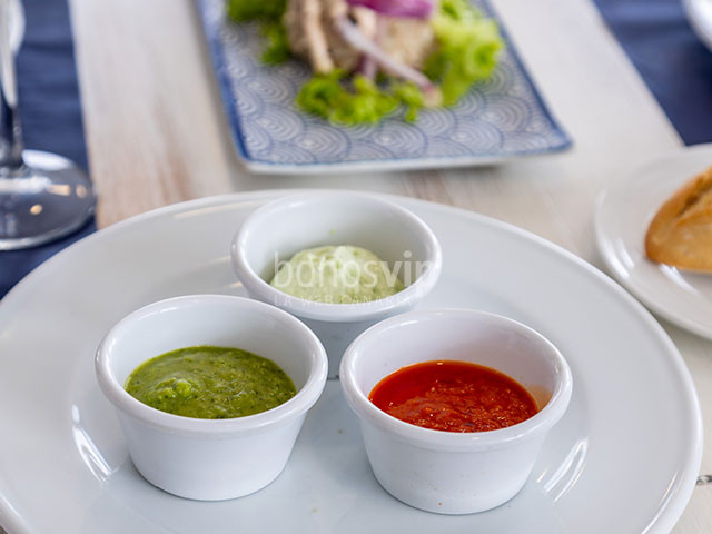 Servicio de pan acompañado de alioli, mojo rojo y mojo verde