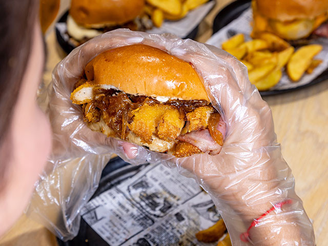 Sweet & Smoky Bacon: topping de miel, doble smash, queso americano, bacon ahumado, aros de cebolla, salsa bourbon y BBQ