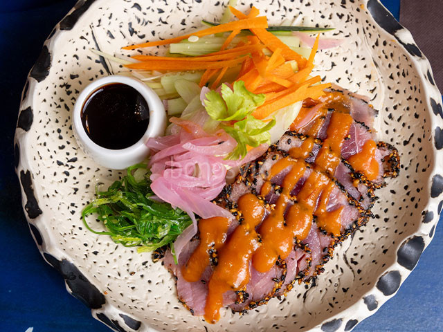 Atún en salsa teriyaki con rebozado de sésamo y salsa de soja