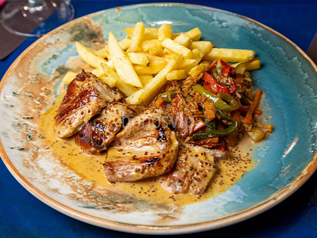 Solomillo de cerdo al ajillo con papas fritas y verduras