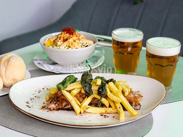 Solomillo de cerdo con salsa de champiñones y papas fritas
