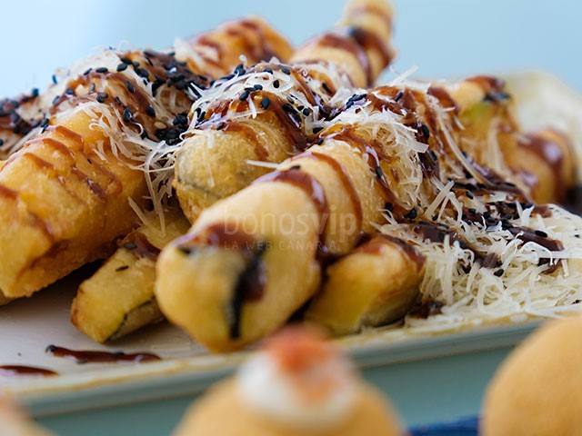 Palitos de berenjena en tempura con salsa hoisin, queso canario rallado y sésamo tostado