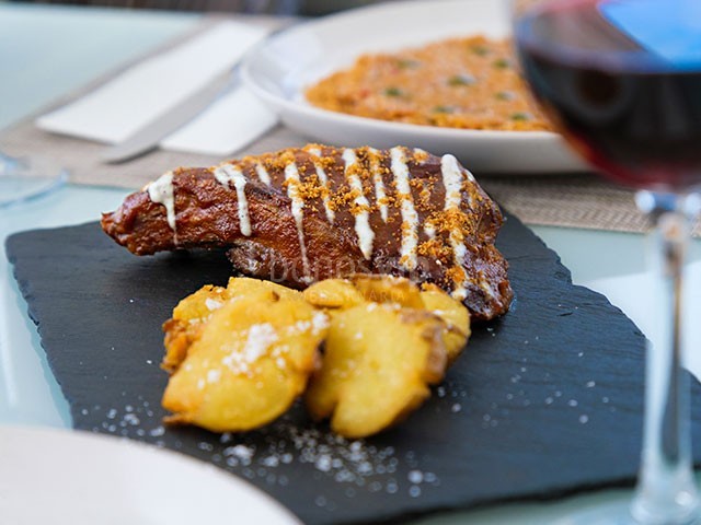 Costillas asadas a baja temperatura con barbacoa de naranja y tostones de papa