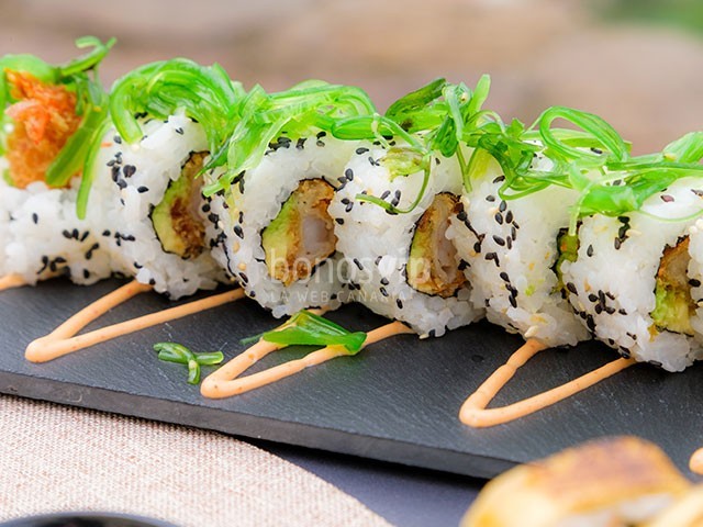 Mar Verde: Langostinos tempurizados, cremoso aguacate y fresco pepino, delicadamente fusionados con mayonesa japonesa. Cubierto con alga nori, semillas de sésamo y coronado con crujiente wakame picado