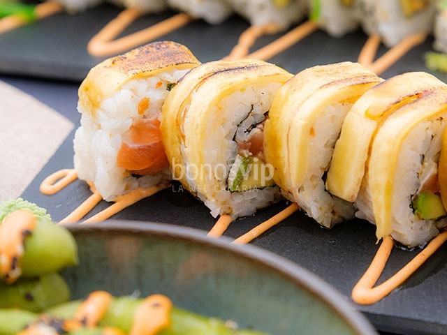 Fuji Roll: Interior de salmón, aguacate y el toque picante del kizami wasabi. Cubierto de láminas de salmón flameado al momento y salseado con teriyaki dulce