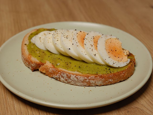 Tosta de huevo: Crema de aguacate con un toque de limón, huevo duro en rodajas, sal en escamas y pimienta negra recién molida