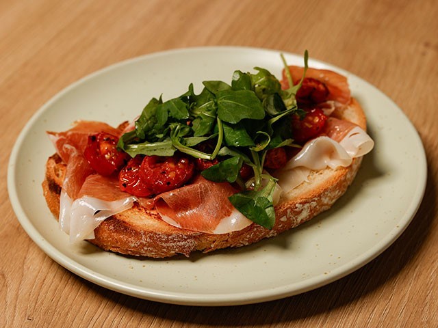 Tosta de serrano: Jamón serrano con tomate seco, rúcula y aceite de oliva