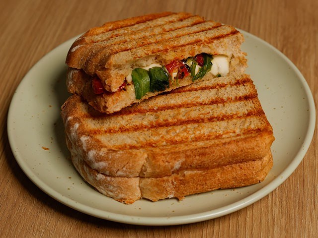 Sandwich capresse: Mozzarella fresca, tomate confitado, pesto de albahaca y rúcula sobre pan rústico
