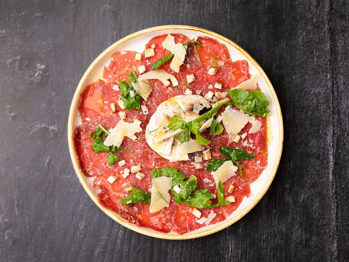 Carpaccio de ternera con finas lascas de Grana Padano, rúcula baby y salsa vitello tonnato