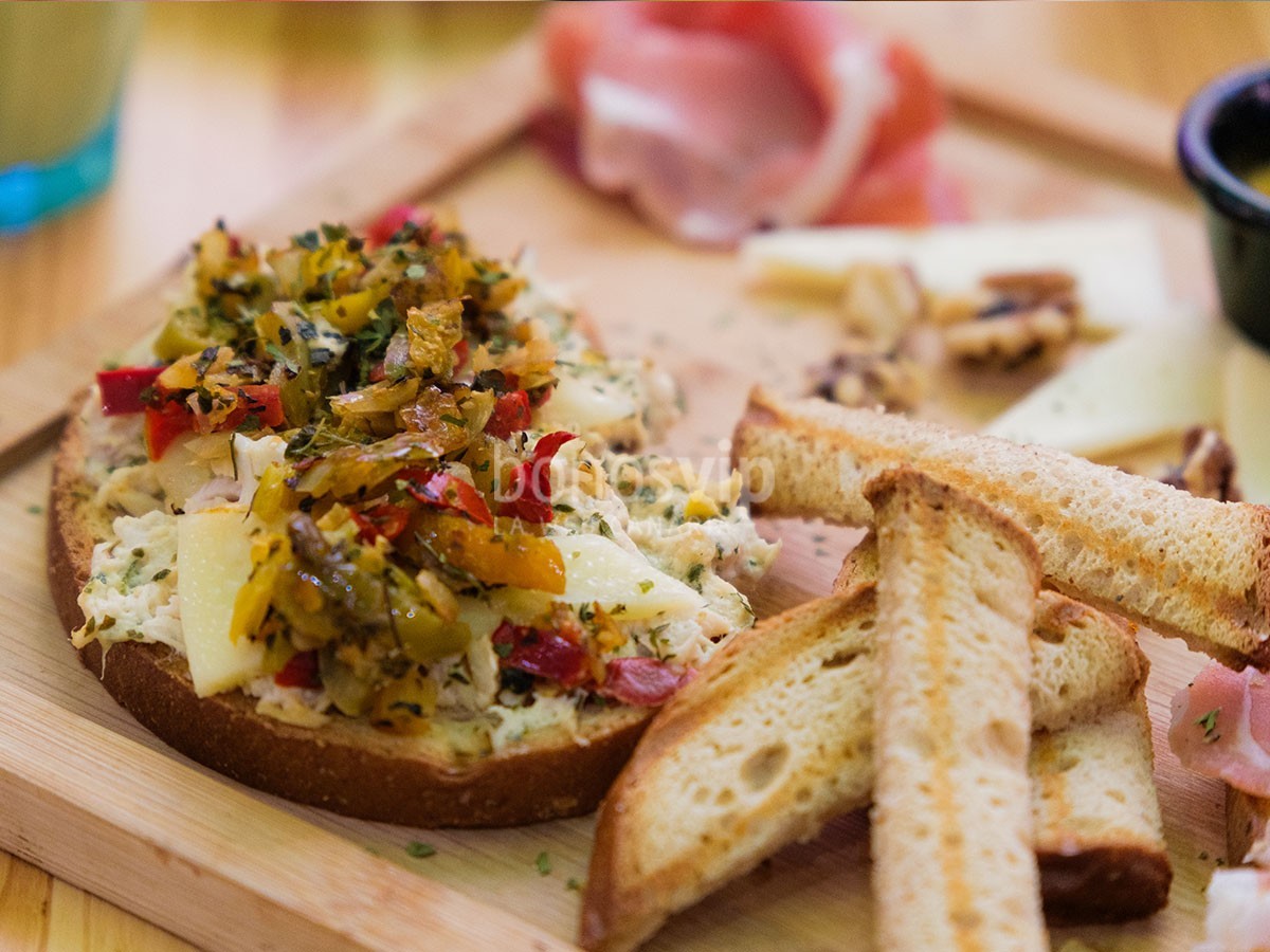 2 tostas a elegir: Serrano con tomate confitado o pollo al curry con verduras