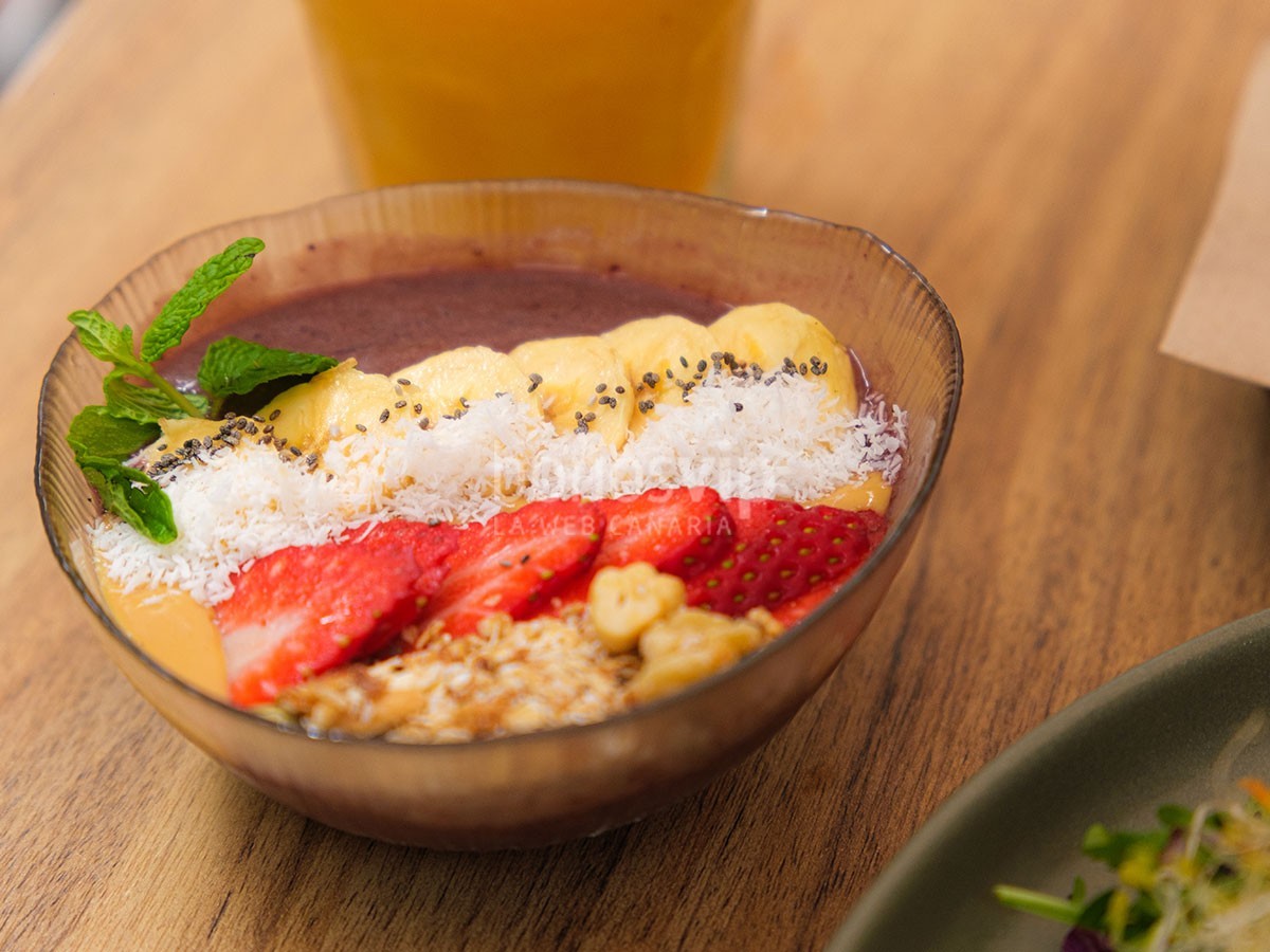 1 copa de yogurt de coco con granola casera, fruta fresca y pasta de cacahuete