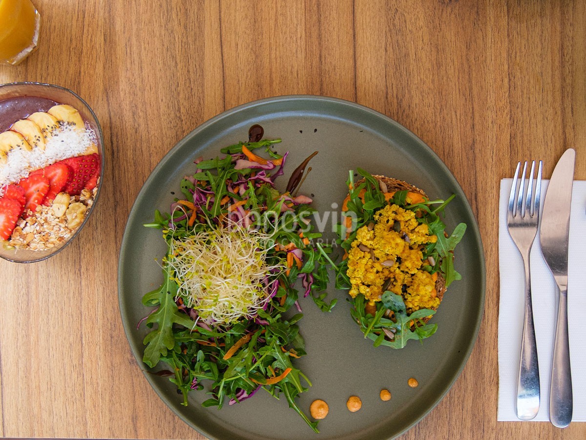 1 tosta pan de cereales con salsa de pimientos ahumados, “huevo revuelto” de tofu nutritivo, rúcula fresca y semillas