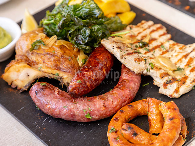 Parrillada carne con pollo, bistec, variedad de salchichas acompañado de papas fritas y salsa de aguacate