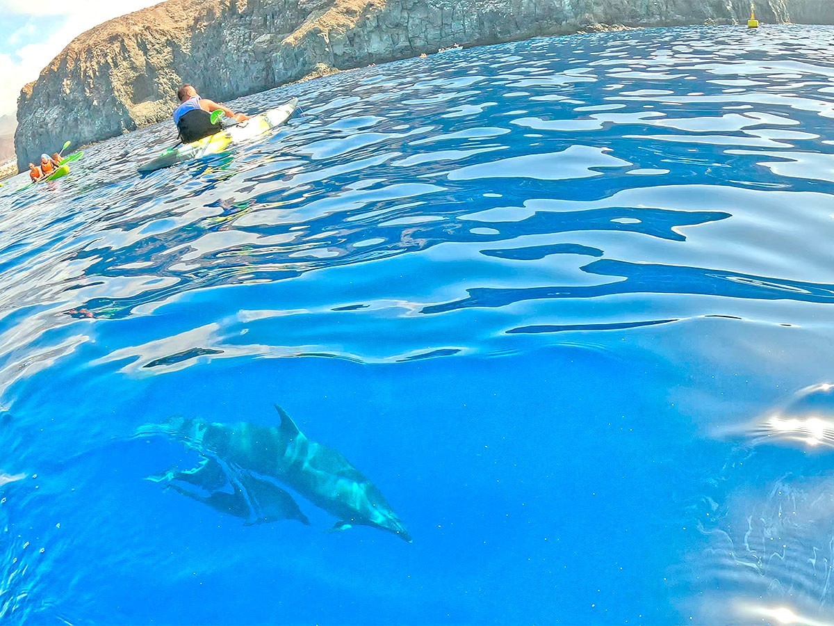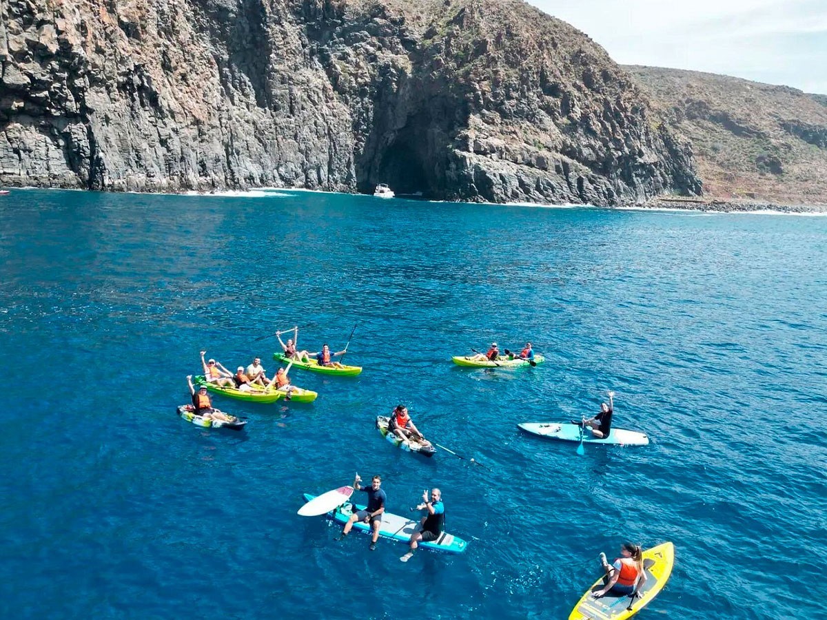 Descubre la costa de Palm-Mar con una experiencia guiada de kayak y snorkel junto a Kayaking Shingi Adventures, recorriendo la bahía de los delfines y las tortugas, un entorno natural donde es habitual ver fauna marina en libertad, mientras navegas junto a acantilados volcánicos y haces una parada para practicar snorkel en aguas cristalinas cerca de la Cueva de los Enamorados, todo en grupos reducidos y con un ambiente cercano y divertido