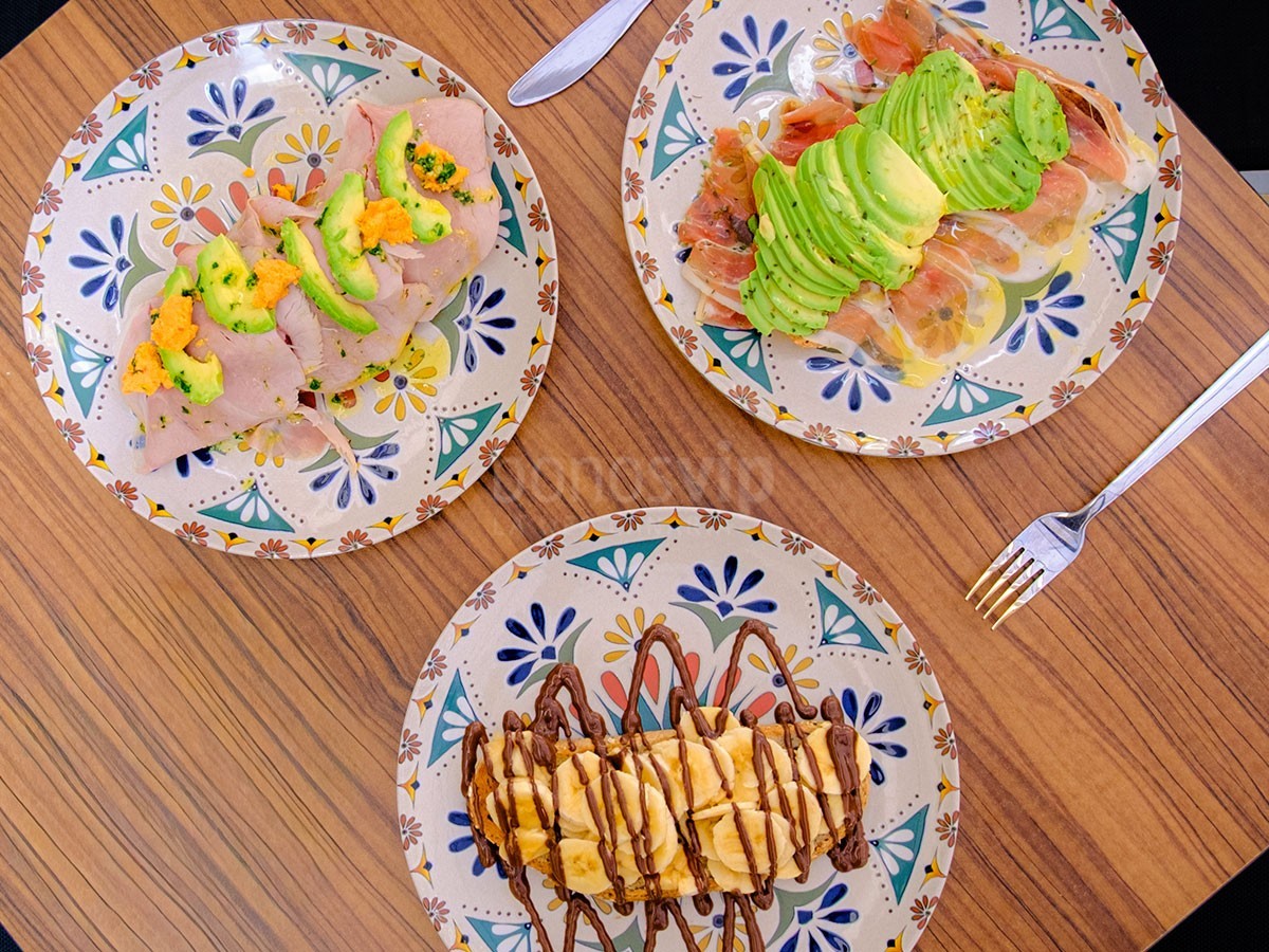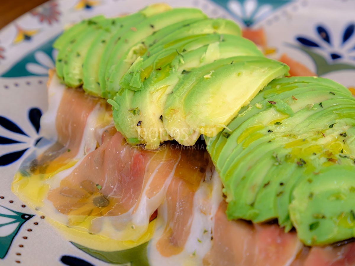 Tosta de aguacate, jamón ibérico, aceite de oliva y orégano