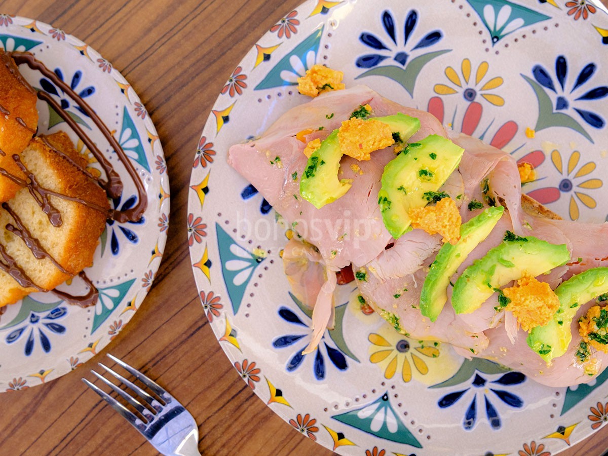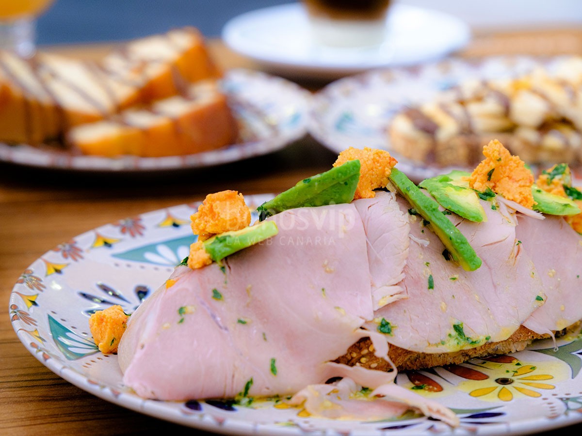 Tosta de batata, pata, aguacate y almogrote