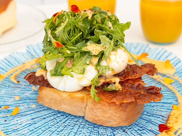 Huevos benedictinos al estilo Gozo: Sobre tosta de pan brioche artesanal, con salsa holandesa al kimchi, bacon crujiente y brotes tiernos