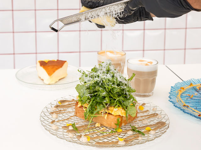Tosta de delicia de huevo revuelto con trufa y crema de champiñones: Tosta de pan brioche artesanal, huevo revuelto con trufa negra, queso de oveja rallado, delicada crema de champiñones y rúcula fresca